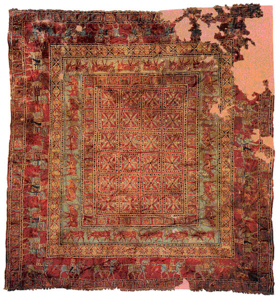 前述の通り、初めてループ編みの絨毯がいつどこで織られたか正確にはわかっていません。しかし、最古現存ループ絨毯は、1947年ロシア人考古学者(ルデンコ)によりシベリア、アルタイ山脈のパジリクの谷のスキタイ王子の墓で発見され、現在、レニングラードのエルミタージュ博物館に展示されています。絨毯はトルコのダブルノット技術で織られており、驚くことに、平方メートルあたり、34万7千ノット(平方センチメートルあたり255ノット)で製作されています。大きさは3.62平方メートル(約180x200cm)で、含有炭素から紀元前5世紀のものと推定されています。この絨毯は埋葬された後に洪水があり、凍結され、ルデンコにより発見されることになりました。パジリク、アルタイ絨毯は洗練されており、長い織物の歴史と伝統の結晶であることを示しています。
