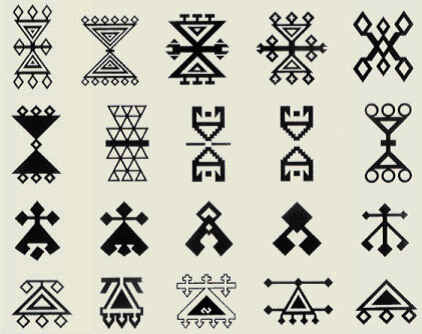 Just as with a little girl's braided pony-tail where strands of the shorter and stiffer hair stick out, the goat hair sticks out of the woven fabric, gets wet, drops and partially cover the holes in the flatweave, thus making the tent almost waterproof. Later on, these nomadic people felt the need to proof themselves from the humidity present in the earthen floors of their tents. They then applied the very same techniques of flatweaving to make their floor coverings and called them "Kilims". Since these people were pagans, most flatweave designs reflected stylised depictions of worshipped symbols.